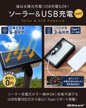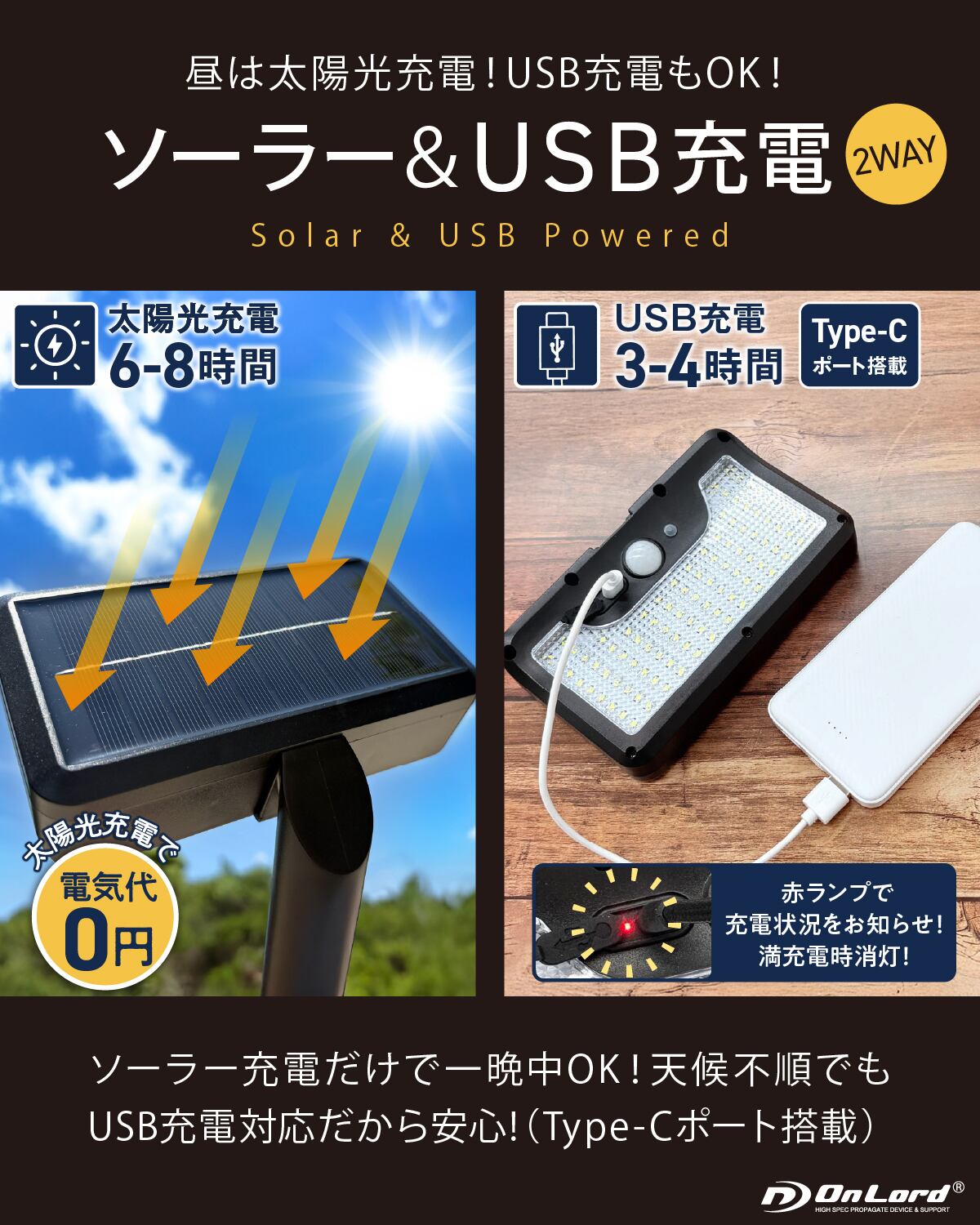 【ソーラー充電&USB充電の2WAY充電】昼間はソーラー充電で電気代0円!天候不順が続いてもUSB Type-C充電が可能!地震や台風等で停電時の照明にも。