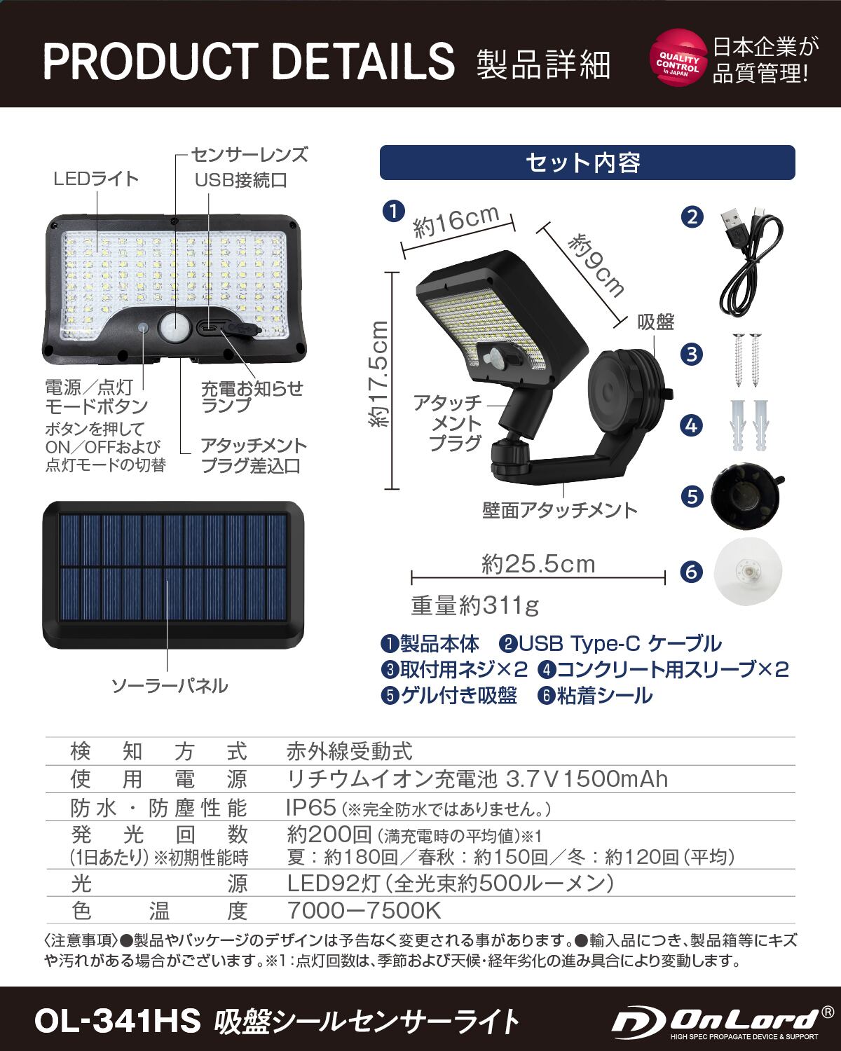 【送料無料】ソーラーライト センサーライト IP65防水 人感センサー 吸盤 シール 360度調整ライト 3モード USB充電可 92LED 窓 ガラス 停電 防災対応 OL-341HS オンロード(OnLord) | OnSQUARE(公式|オンスクエア販売サイト)