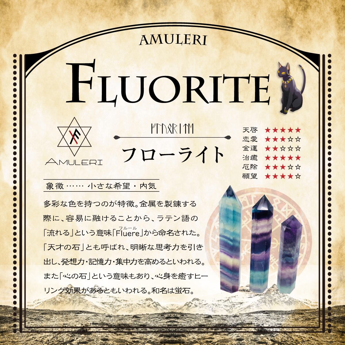 ・「心の石」という意味もあり、心身を癒すヒーリング効果があるといわれます。和名は蛍石。